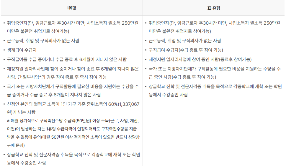 수급자격 및 지원 내용I유형,Ⅱ유형을(를) 제공하는 표I유형Ⅱ유형