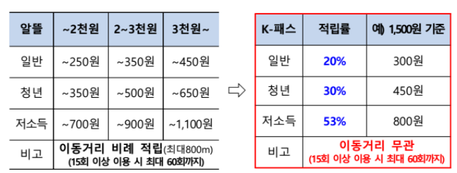 ** 알뜰 교통카드는 이동거리에 따라 적립차이가 있었지만 K패스는 이동거리와 상관없습니다.